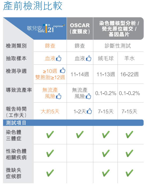 Safe T21進階版可以全面檢測胎兒23對染色體相關疾病,包括所有染色體三體症及126項微小至3Mb的微缺失或微重複。(T21唐氏綜合症、T18愛德華氏綜合症、T13巴陶氏綜合症及性染色體相關疾病。)懷孕滿10周/雙胞胎12周以上便可檢測。
